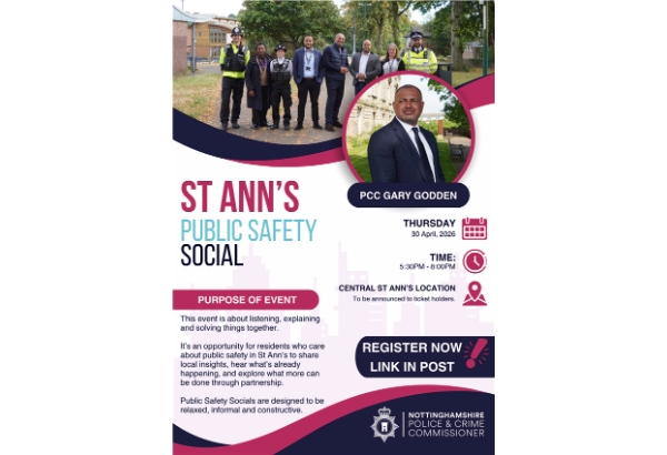 Join Nottinghamshire’s Police and Crime Commissioner Gary Godden for a Public Safety Social in St Ann's, an open, community-led conversation about what helps people feel safe where they live, work and travel.